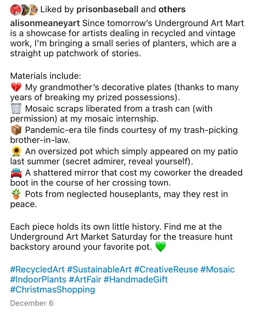 From showcasing the process behind creating mosaics with salvaged materials to promoting exhibitions and sharing insights into my creative journey, my writing strikes a balance between authenticity and professionalism.